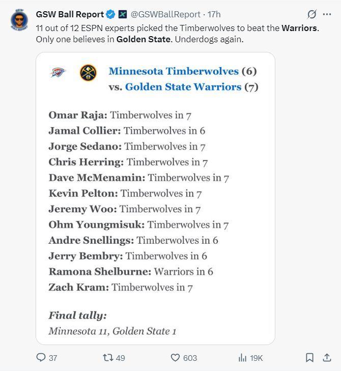 ESPN有11位专家为这轮系列赛预测晋级球队,10人都看好森林狼晋级,其中三人看好勇士6场晋级,有7人看好森林狼七场晋级。