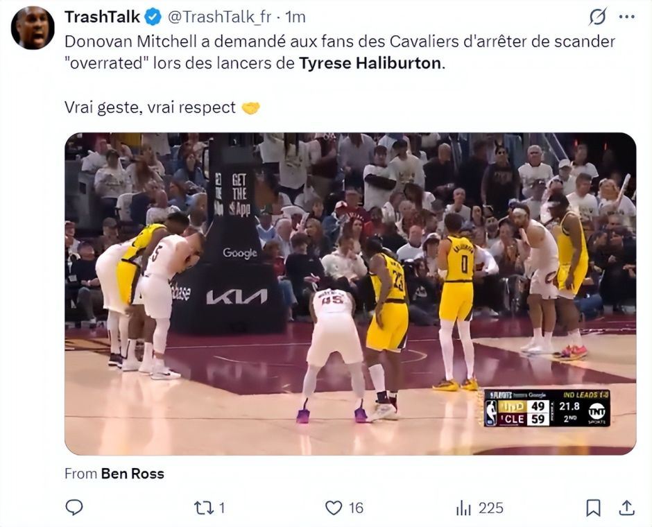 第二节还剩21.8秒哈利伯顿上罚球线,全场球迷呐喊“被高估、被高估”,但米切尔挥手示意让球迷们不要再说“被高估”,这是对哈利伯顿的尊重,米切尔这个暖心的做法也得到了全美球迷的认可。