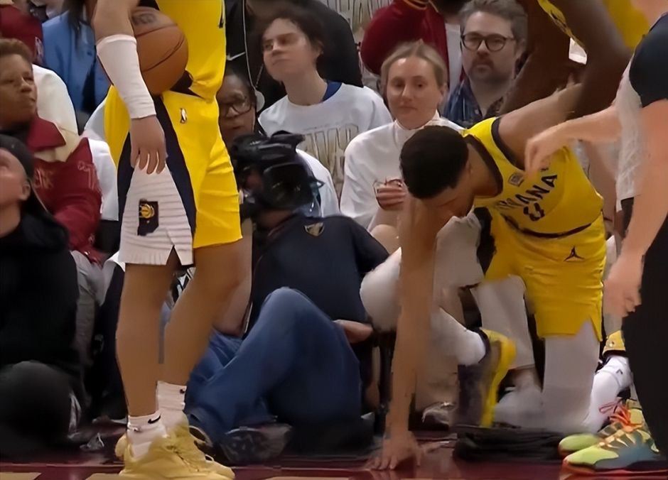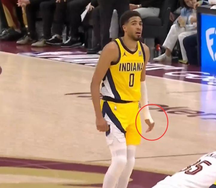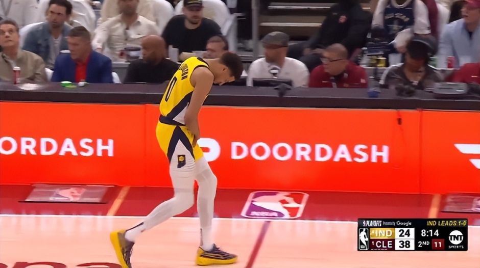 第二节哈利伯顿在一次卡位中意外挫伤手腕,他被身后的两人推搡,他的手直接戳到了队友沃克的身上,随后哈利伯顿痛苦的捂着自己的左手腕。