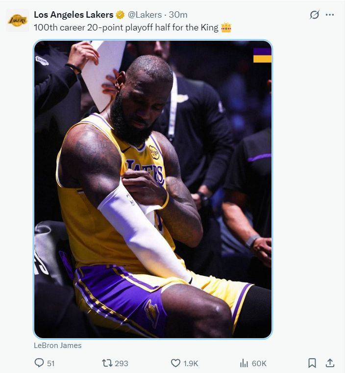 湖人官方也写道,勒布朗第100次半场20+历史第一,这就是King戴皇冠。
