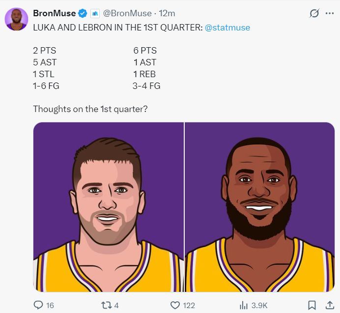 首节老詹的手感就很好,单节4中3就丢了一个外线,拿到6分,而东契奇首节只有6中1,东皇遭到了肠胃炎的影响。