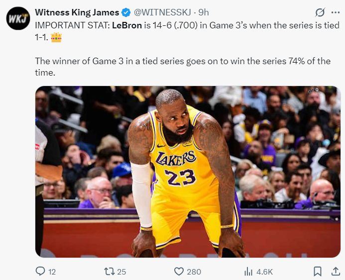 赛前美媒写道:勒布朗生涯首轮G3的战绩是14胜6负,胜率70%,但在打成1-1的情况下,他拿到第三场胜利后有74%的概率赢得系列赛。