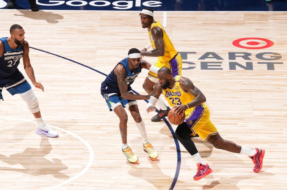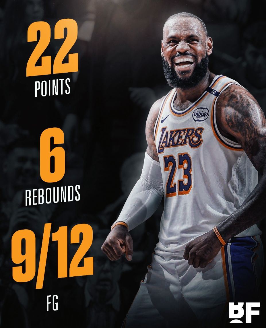 第二节是勒布朗是大爆发,单节6中5+三分2中2+罚球4中2拿到14分3篮板1盖帽,湖人一波13-5就是勒布朗引来,他直接帮助湖人完成了反超,随后被雷迪克换下休息。老詹上来后一个2+1但罚球不中,半场12中9拿到22分6篮板,完成第100次半场季后赛20+历史第一。