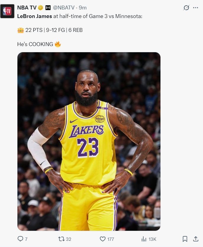 NBATV官方也晒出勒布朗半场的数据为他戴上皇冠,写道He's Cooking。