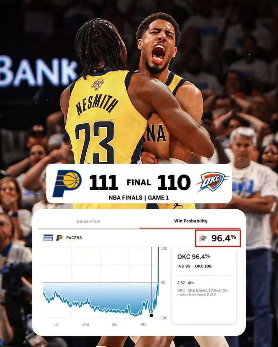 季后赛总决赛G1:步行者末节开局落后15分,哈利伯顿还剩0.3秒命中准绝杀,步行者111-110完成逆袭,扭转最多96.4%输球概率。