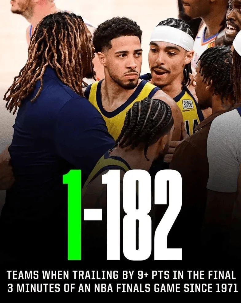 步行者的神奇表现还延续到总决赛,他们在总决赛G1不仅是完成15分大逆转,且最后不到3分钟时落后9+,过往总决赛历史该情况是0胜182负,而步行者改写历史为1胜182负。