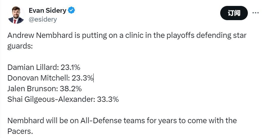 数据显示,季后赛面对内姆布哈德防守时,利拉德的命中率是23.1%,米切尔的命中率是23.3%,布伦森的命中率是38.2%,亚历山大的命中率是33.3%。Sidery认为未来数年,内姆布哈德将成为步行者队中常年入选最佳防守阵容的球员。