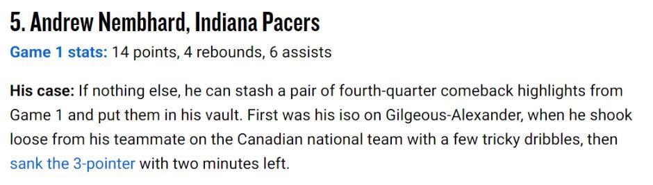 在今年的最佳防守阵容评选中,内姆布哈德没有得到任何票数,步行者队内只有特纳得到3张第二选票。内姆布哈德在总决赛G1很好地限制了亚历山大,在他盯防时,亚历山大投篮9中3,只有33.3%的命中率,而这位新科MVP在常规赛的投篮命中率是51.9%,季后赛也有47.1%。